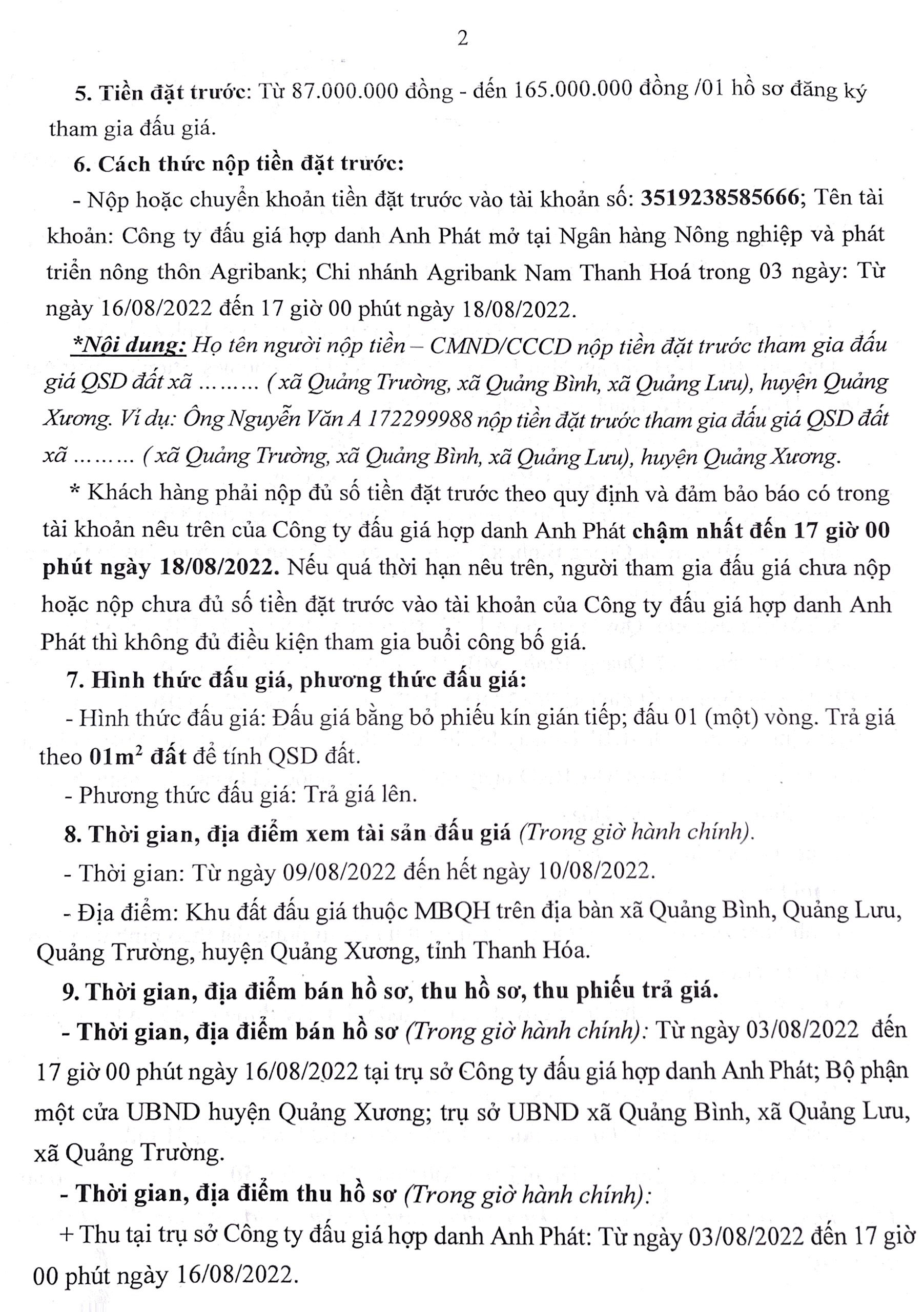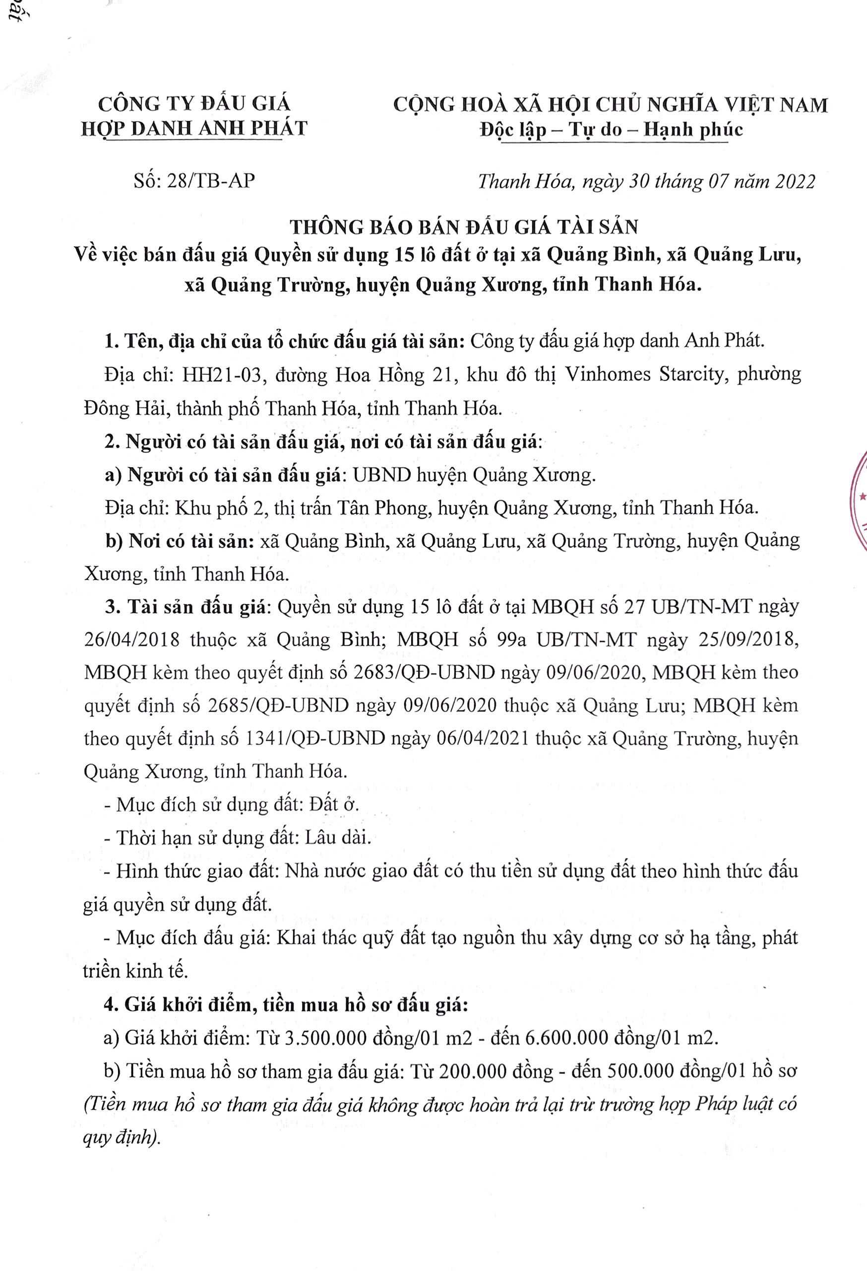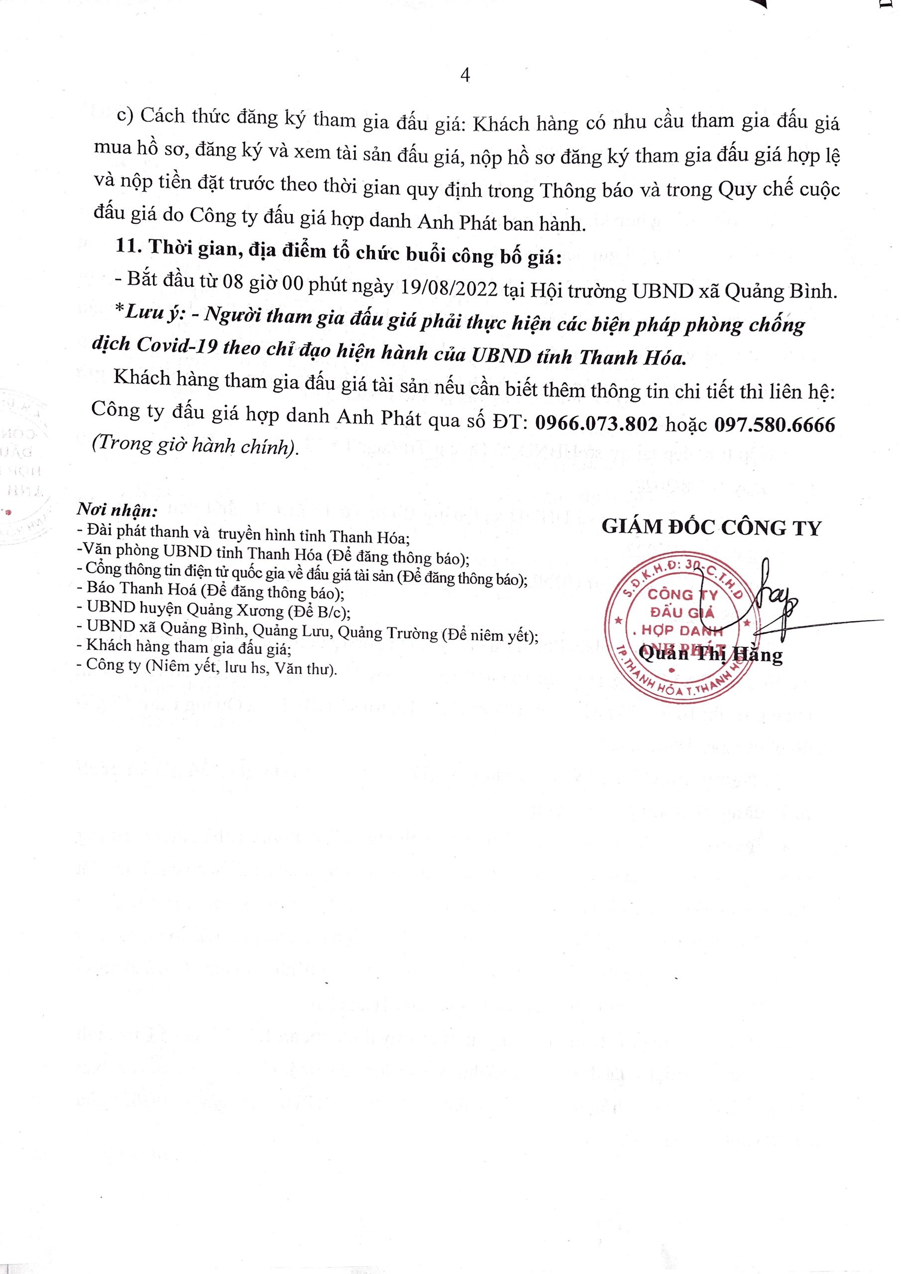 Thông báo bán đấu giá tài sản quyền sử dụng 20 lô đất ở trên địa bàn xã Quảng Nhân, huyện Quảng Xương, tỉnh Thanh Hóa