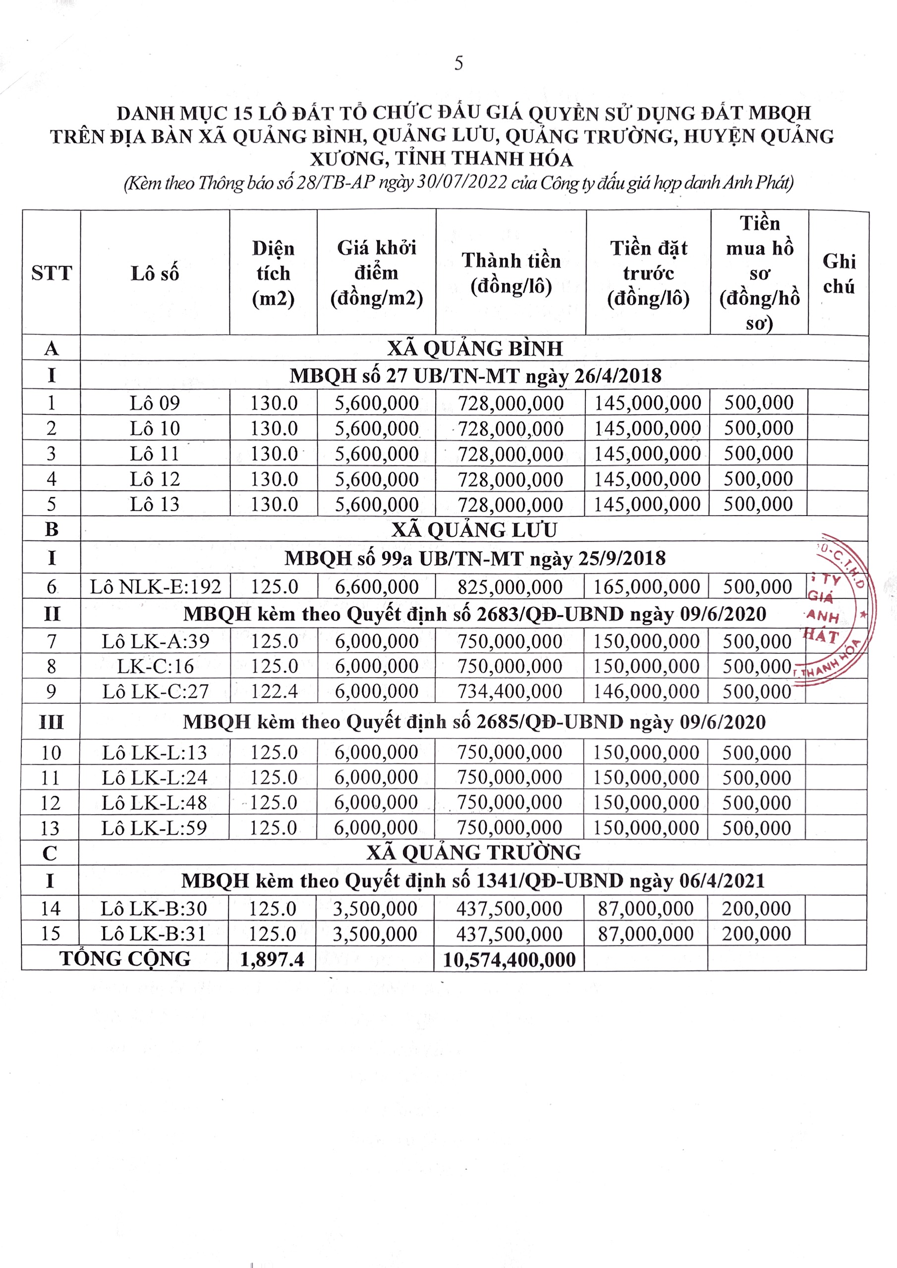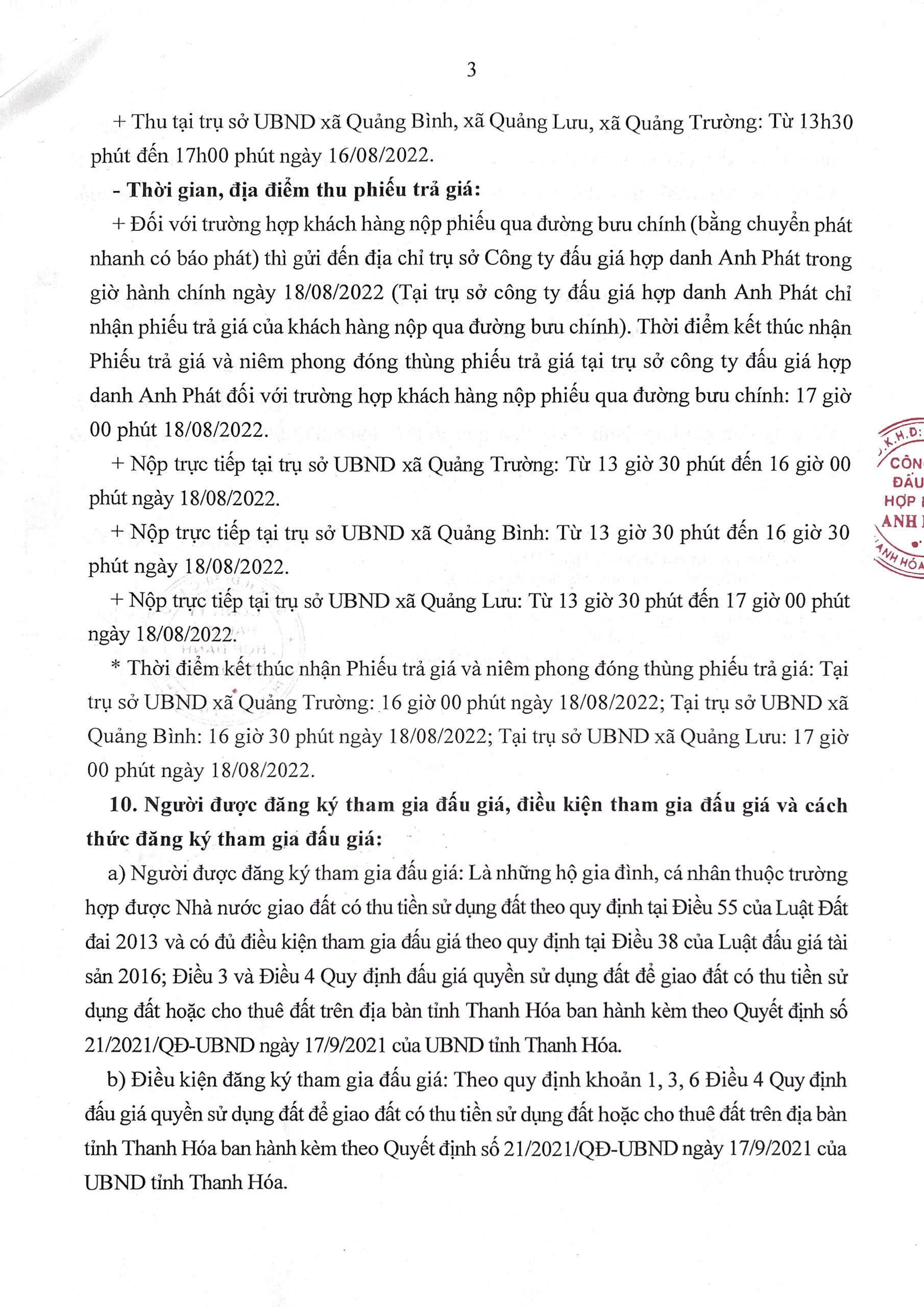 Thông báo đấu giá QSD đất các xã Quảng Bình, xã Quảng Trường, xã Quảng Lưu, huyện Quảng Xương, tỉnh Thanh Hóa